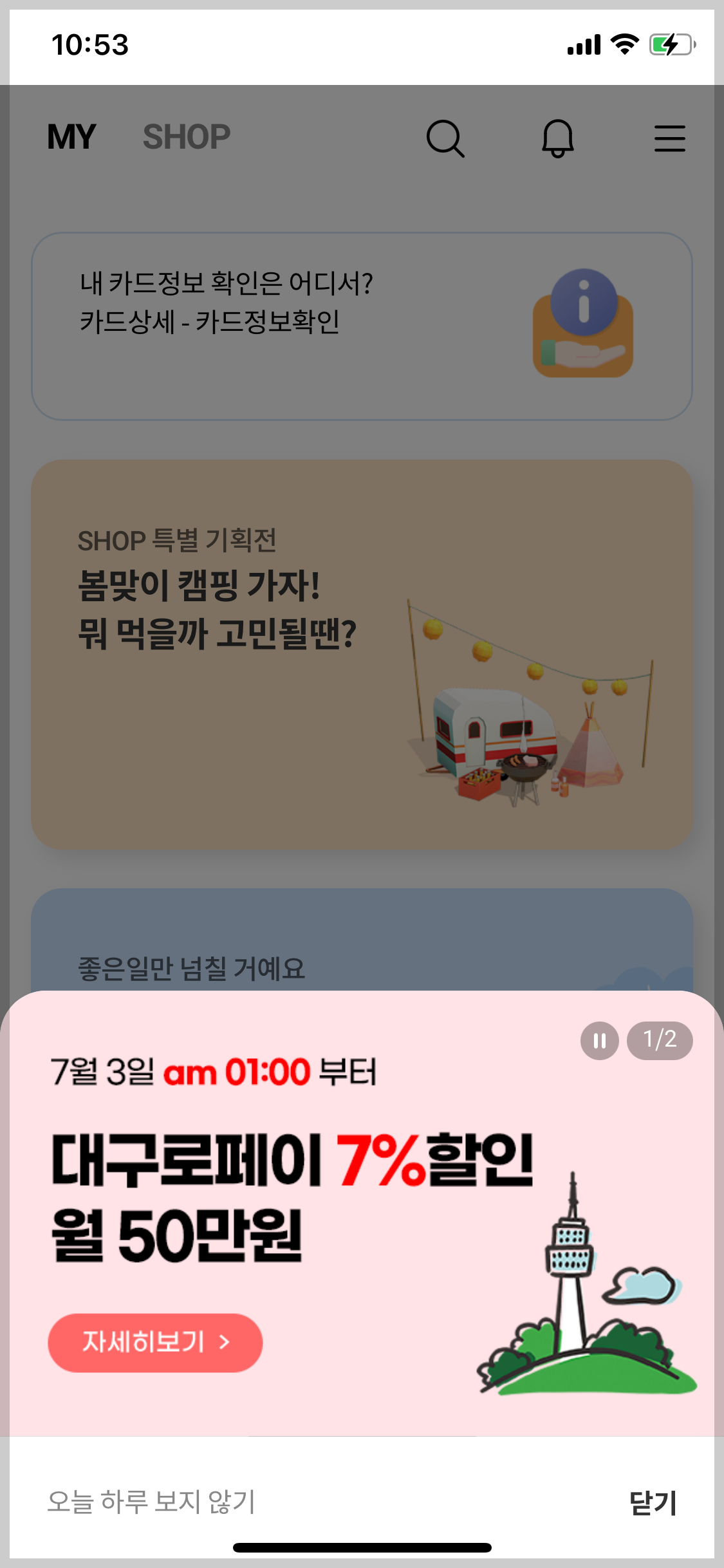 팝업창을 옆으로 쭉쭉 넘기면 빨간색 대구로 페이가 보입니다.
