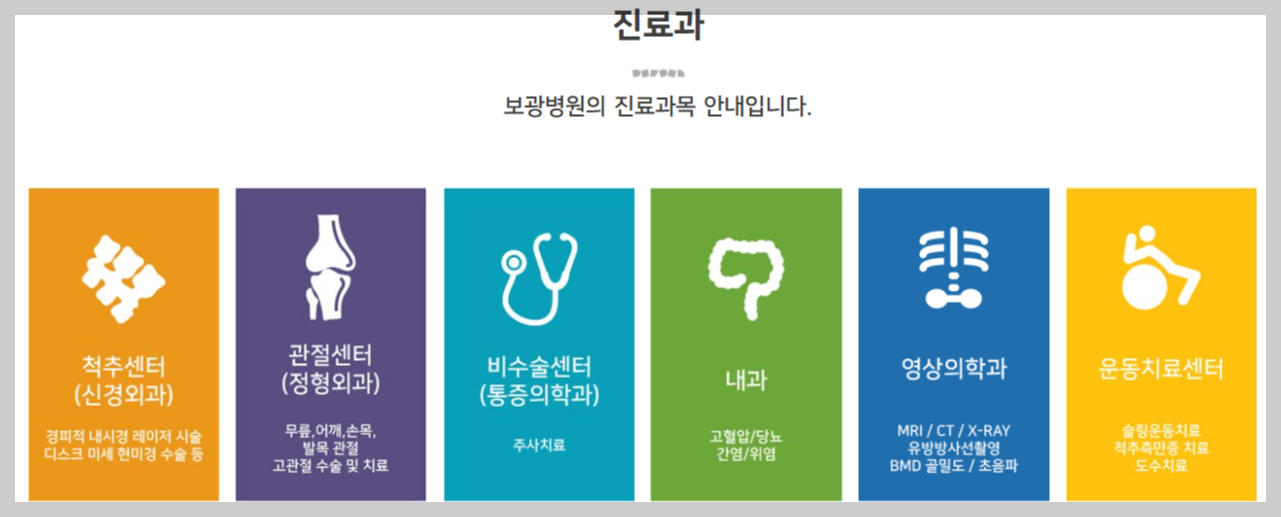 보광병원의 진료는 척추, 관절, 비수술, 내과, 영상의학과, 운동치료센터가 있습니다.