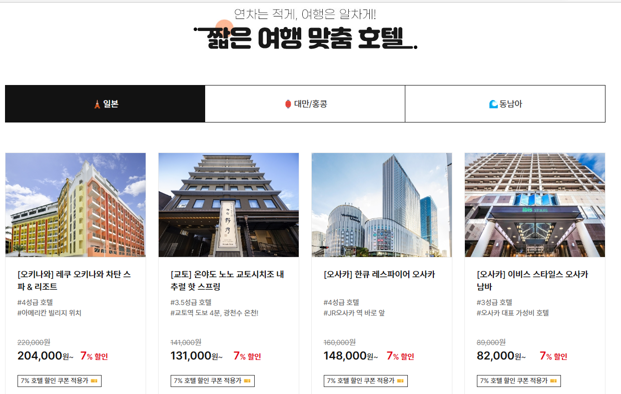 각 국가의 호텔 투숙권을 저렴하게 프로모션 해놓는 경우가 많으니 자주 클릭해서 득템 하시면 좋겠습니다.