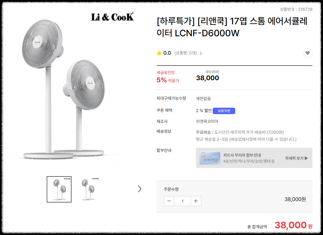 서큘레이터를 할인쿠폰 5% + 동행쿠폰 2%를 적용해서 최종 결제 금액은 37,240원으로 구매했습니다.