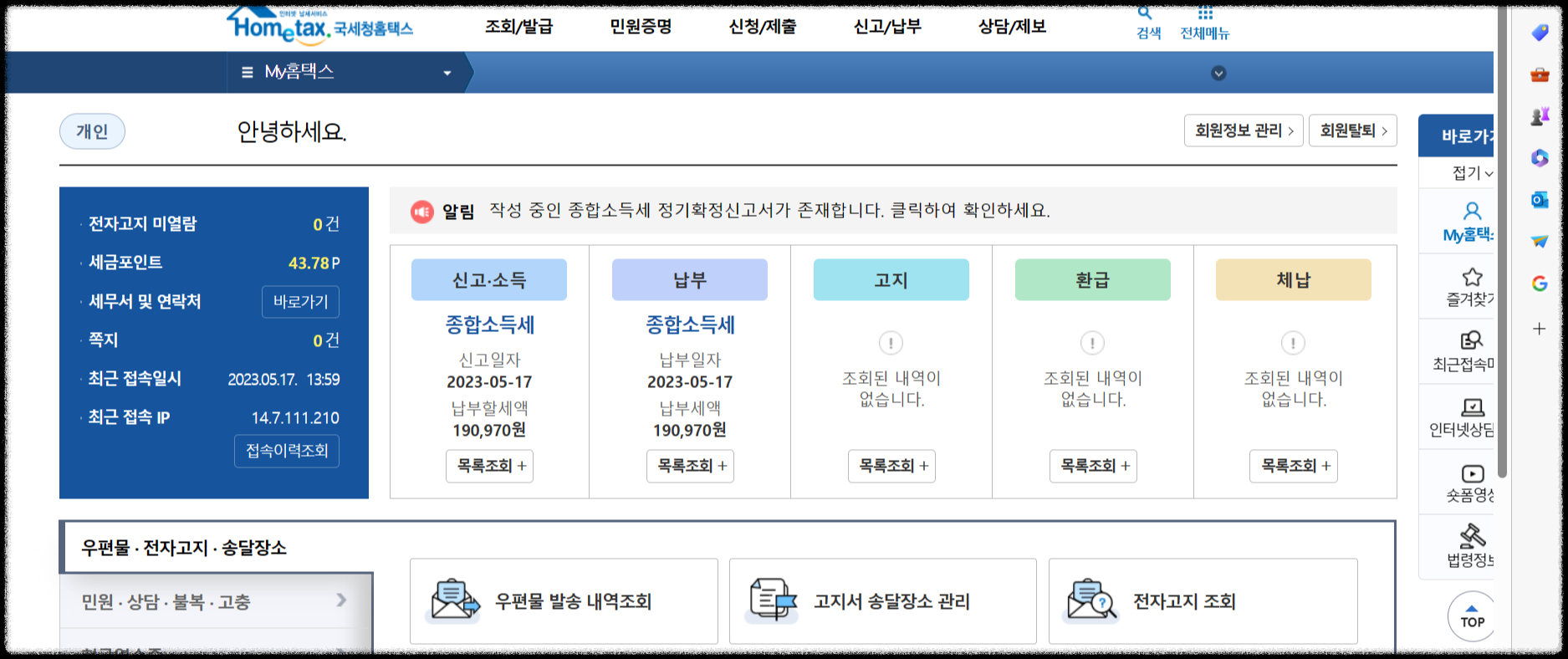 홈택스 홈페이지에서 즉시 조회가능