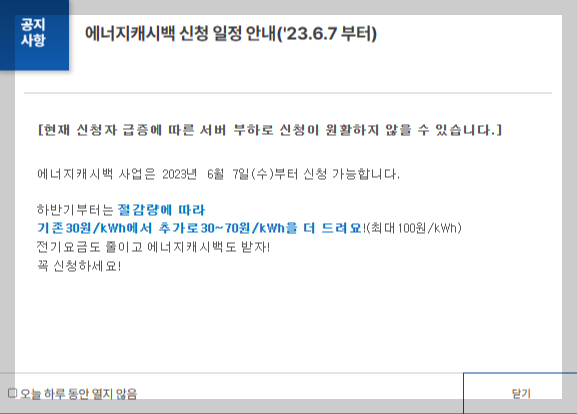 에너지 캐시백 즉시 신청하러 가기 클릭 전기 사용량을 전년 동월 대비 10% 감축하면 현금 등으로 돌려받는 ‘에너지캐시백’ 접수가 6월 7일 시작됐습니다. 7월부터는 전기 사용량을 줄이면 기존에 받던 에너지캐시백 액수에서 1㎾h당 최대 100원을 더 받을 수 있습니다. 기획재정부는 이른 더위와 지난 5월 결정된 전기요금 인상 등에 따른 국민의 에너지비용 부담을 덜어주기 위해 이같이 에너지캐시백 지원을 강화하기로 했습니다.